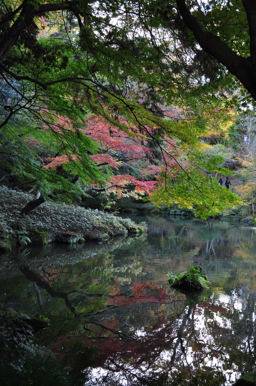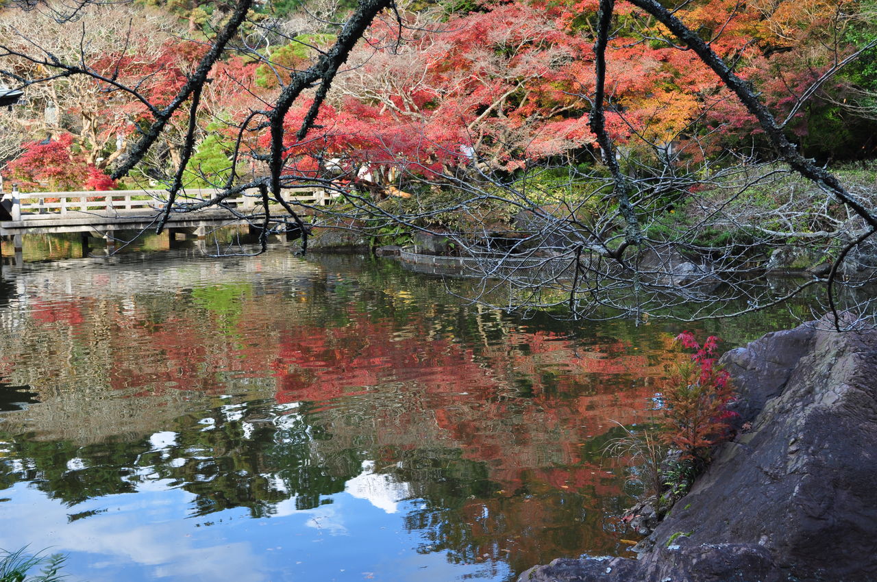 池に紅葉が映っています。