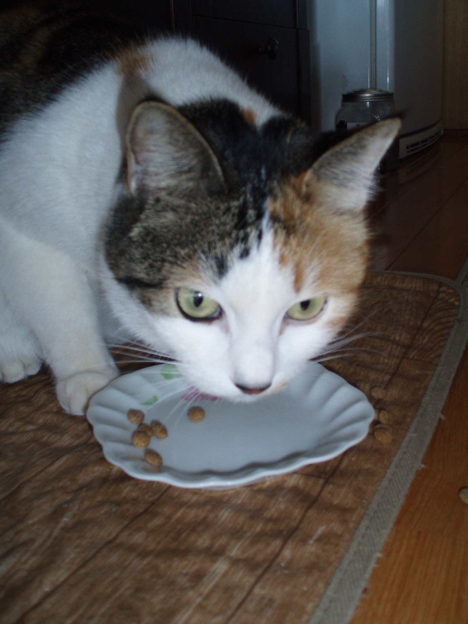 子犬の時、箱に入れて捨てられているところを保護。高齢の15歳。左目が白内障だけど食欲は止まらない